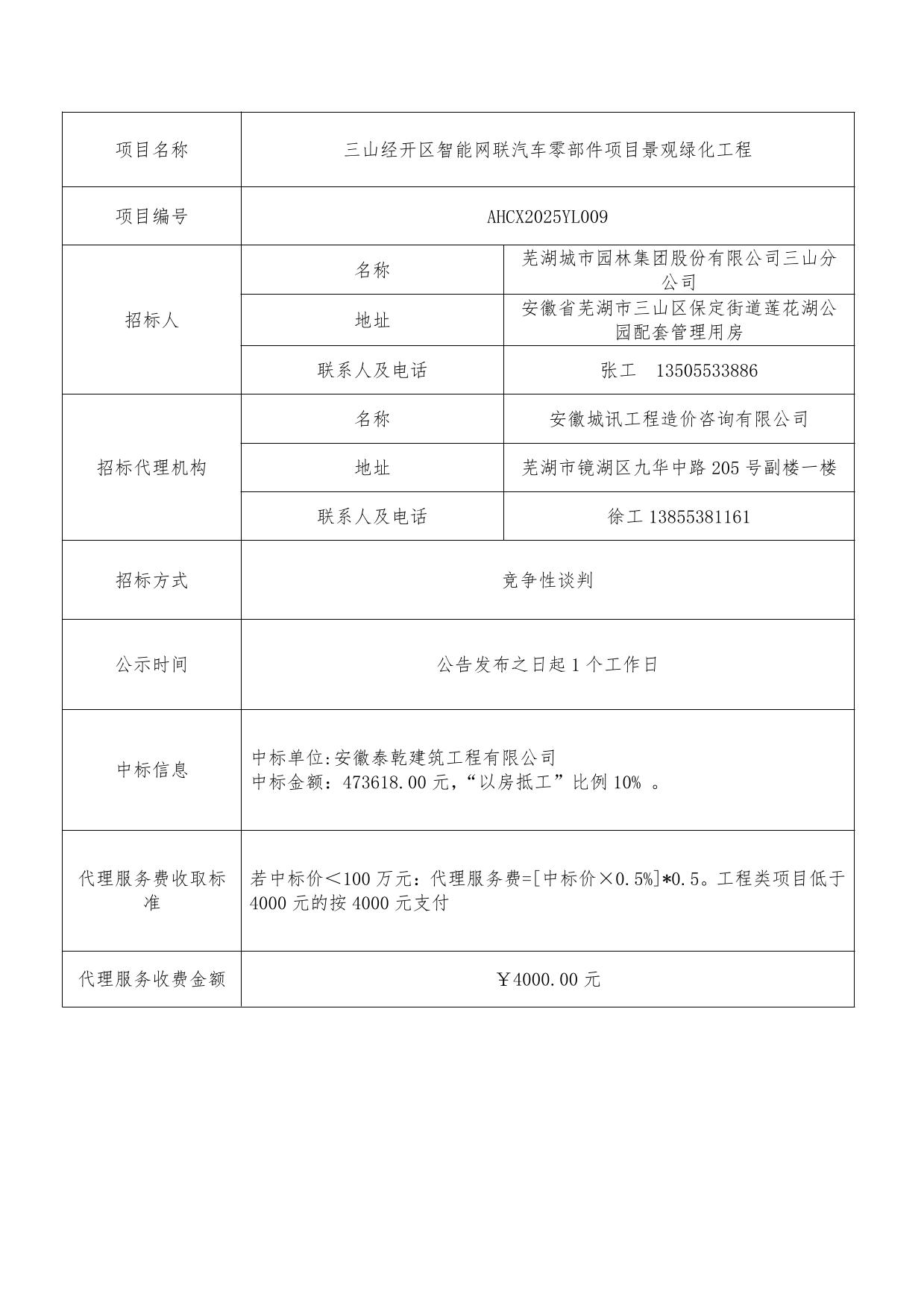 三山經(jīng)開(kāi)區智能網(wǎng)聯(lián)汽車(chē)零部件項目景觀(guān)綠化工程成交結果公告