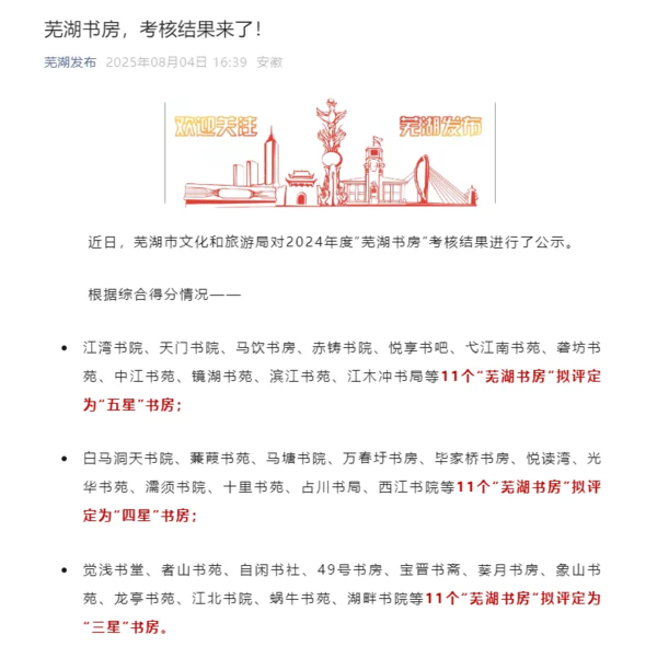 權威發(fā)布!根據 “蕪湖發(fā)布”官方公示(2025年8月4日) 及 《2024年度“蕪湖書(shū)房”考核結果公示》鏡湖書(shū)苑在蕪湖市文化和旅游局的嚴格考核中表現卓越,成功躋身 “五星書(shū)房” 行列!