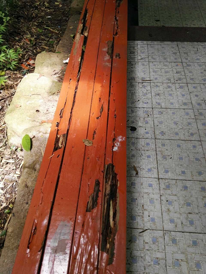 文明城市創(chuàng )建迎檢期間,公司對赭山公園內的基礎設施進(jìn)行全面檢查,檢查中發(fā)現公園長(cháng)廊有部分座椅腐爛,在維修過(guò)程中發(fā)現長(cháng)廊座椅下有少量白蟻,因此,公司立即與白蟻防治所聯(lián)系。