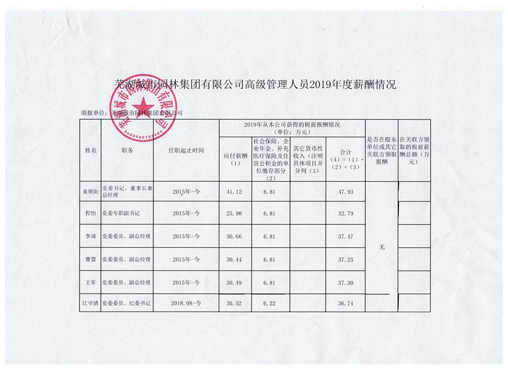 蕪湖城市園林集團高級管理人員2019年度薪酬情況