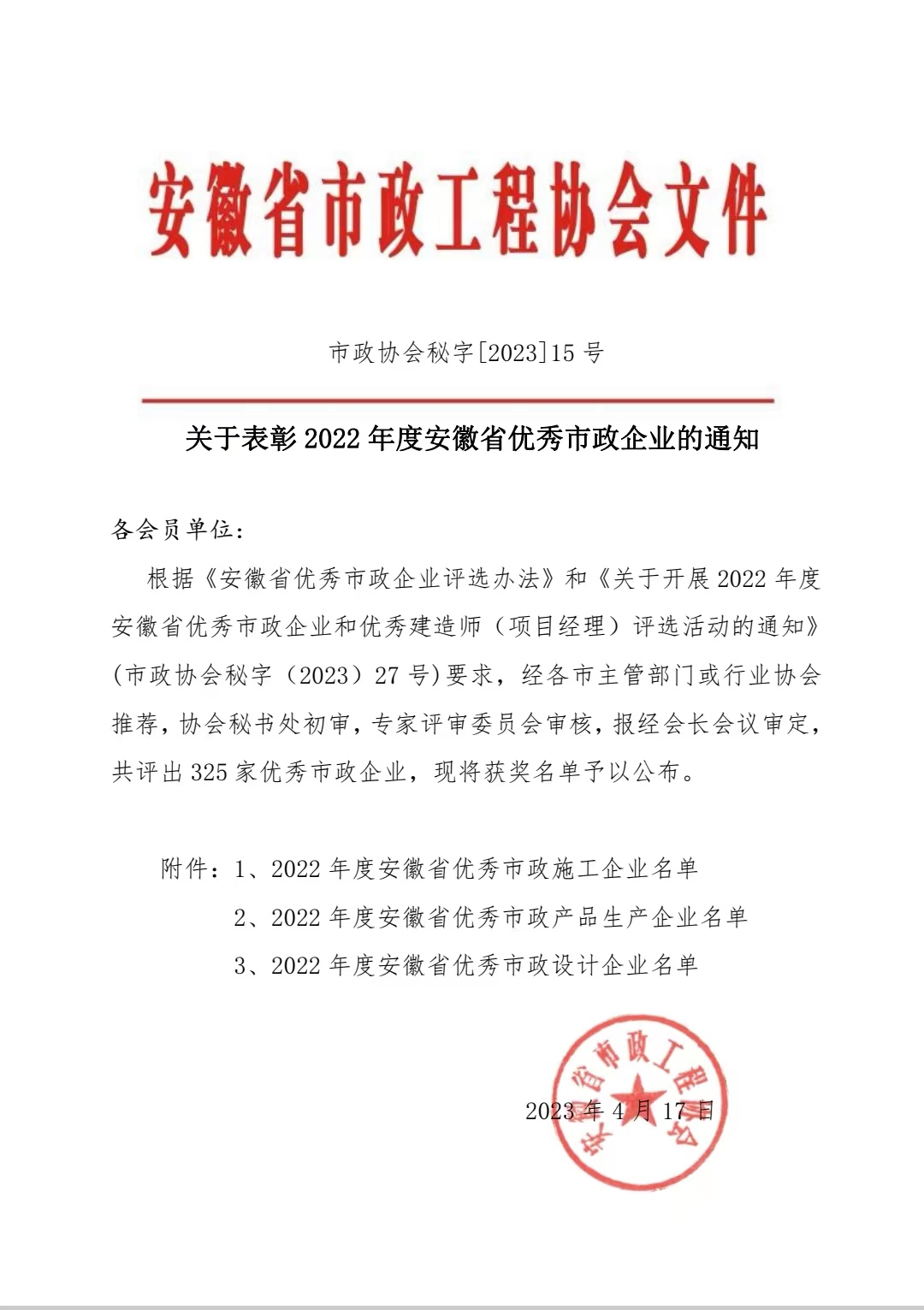 近日,安徽省市政工程協(xié)會(huì )公布2022年度安徽省優(yōu)秀市政企業(yè)名單,園林集團榮獲“2022年度安徽省優(yōu)秀市政企業(yè)”榮譽(yù)稱(chēng)號。