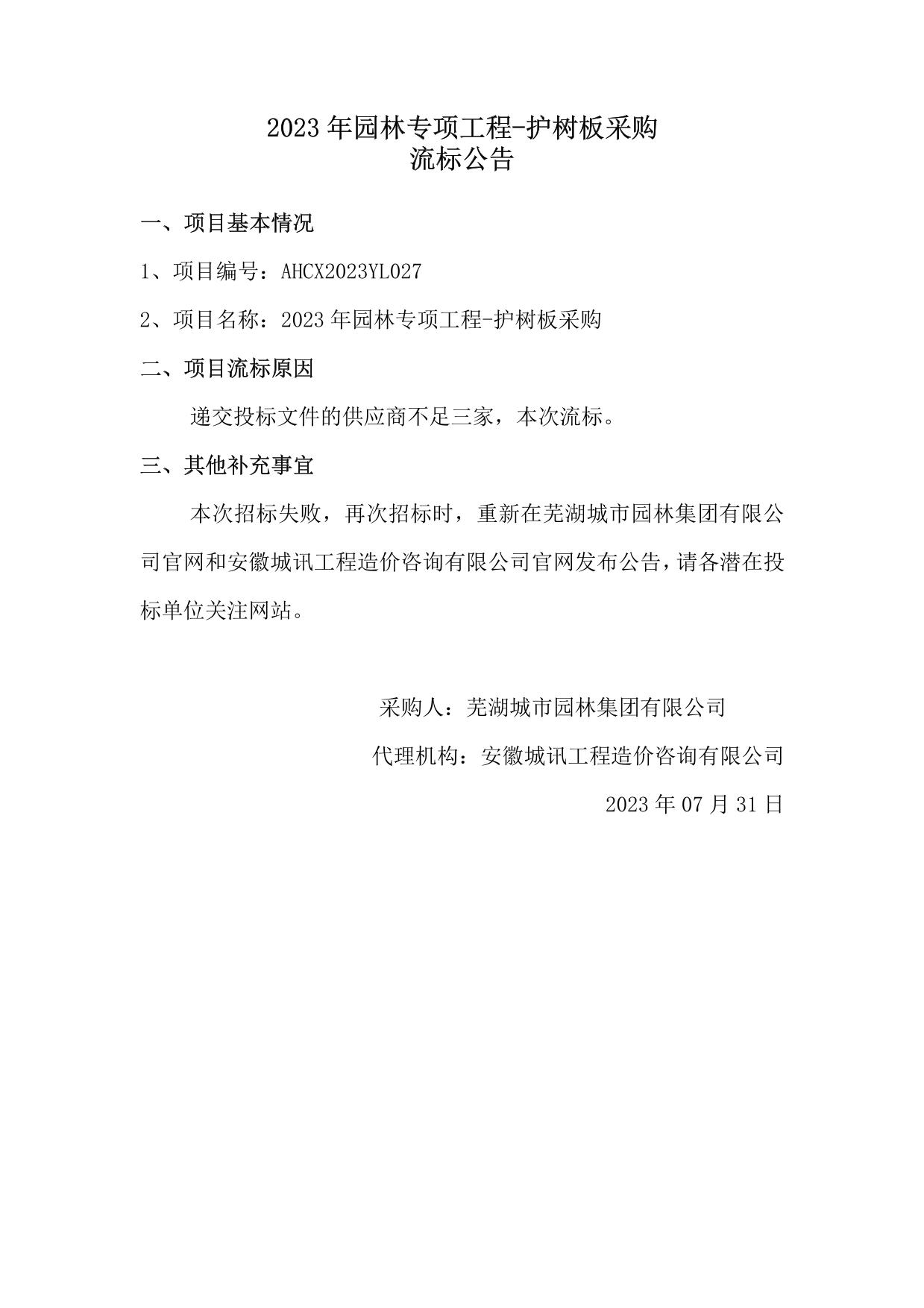 2023年園林專(zhuān)項工程-護樹(shù)板采購流標公告