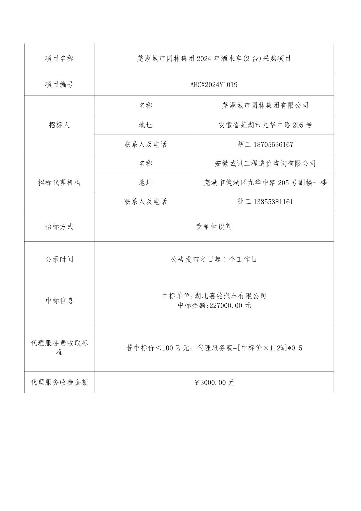 蕪湖城市園林集團2024年灑水車(chē)(2臺)采購項目成交結果公告